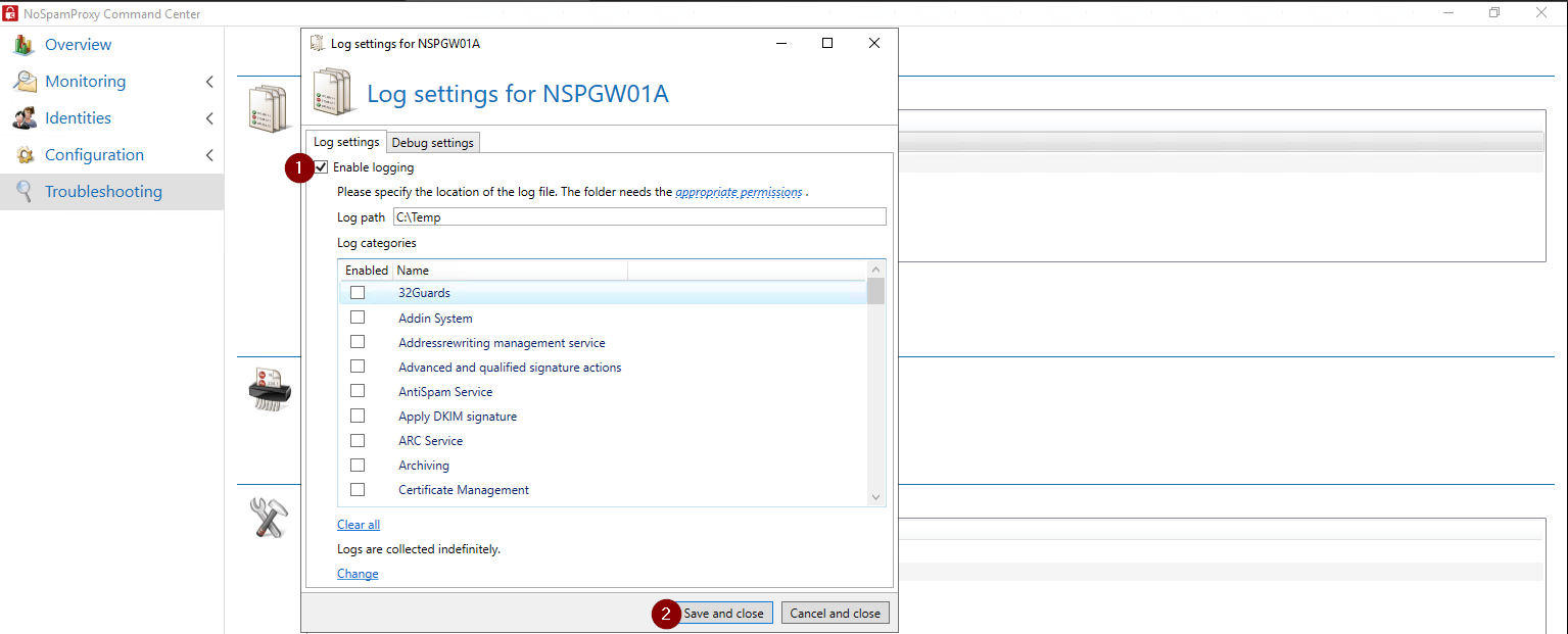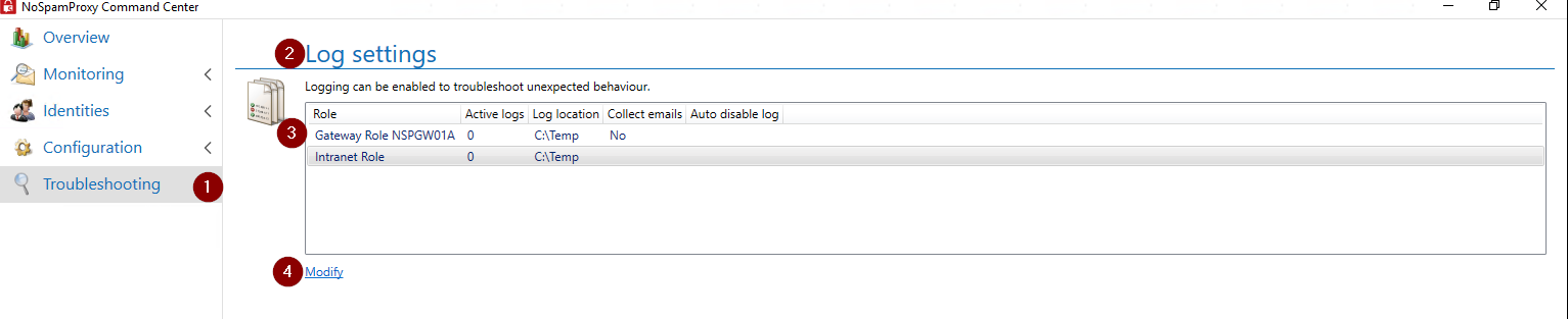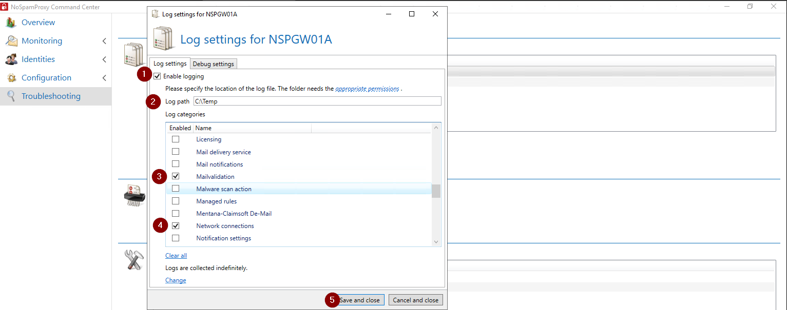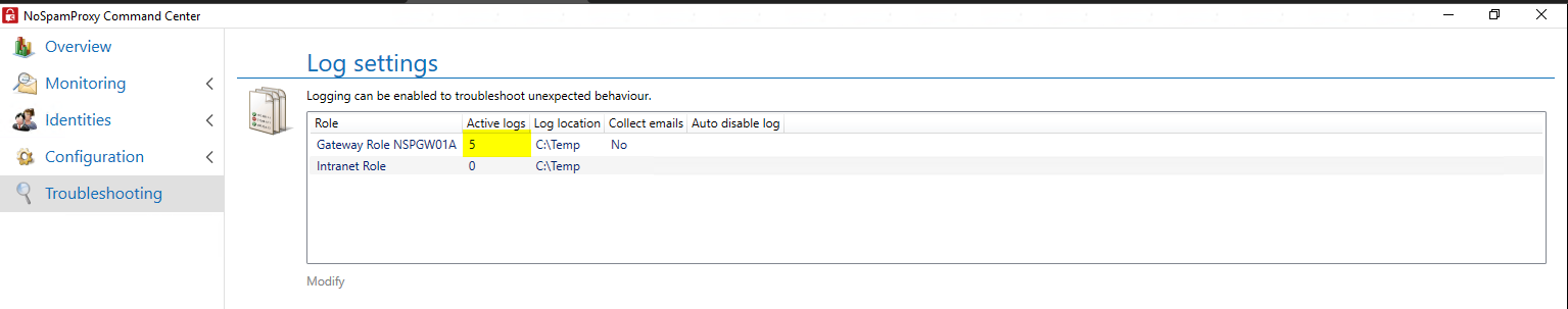 Durch die Beratung des Herstellers wurden die Einstellungen für Gateway -Roll -Datensatz in der Nospamproxy Command Center in der linken Navigation “Fehlerbehebung” aktiviert und konfiguriert.