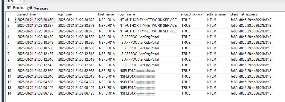 Nachfolgend finden Sie eine SQL-Abfrage, um zu überprüfen, ob SQL-Datenbankverbindungen auf „verschlüsselt“ eingestellt sind. Diese SQL-Abfrage muss auf allen SQL-Servern ausgeführt werden, auf denen die SQL-Datenbank einer NSP-Rolle vorhanden ist.